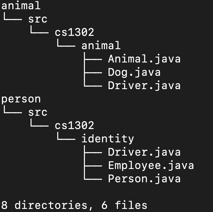 cs1302-inheritanceplays a role in the example. Here is a breakdown of the different subdirectories and their roles:personthe top level directory for the person inheritance example.animalthe top level directory for the animal inheritance example.animal/srcis the default (no-name) package directory for our source code for the animal example.person/srcis the default (no-name) package directory for our source code for the person example.cs1302,animal, andidentityare the named package directories for each example.The three