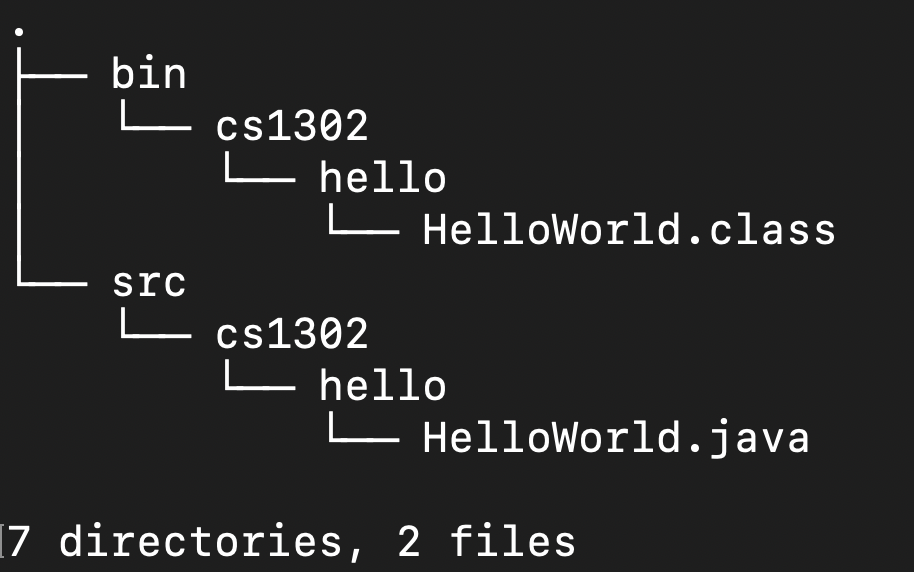 cs1302-packagesdirectory, change into it and run thetreecommand to make sure the directory contains all of the required subdirectories and that those subdirectories are organized correctly. The output should look similar to the above withHelloWorld.javastill contained within thesrcfolder.Move the