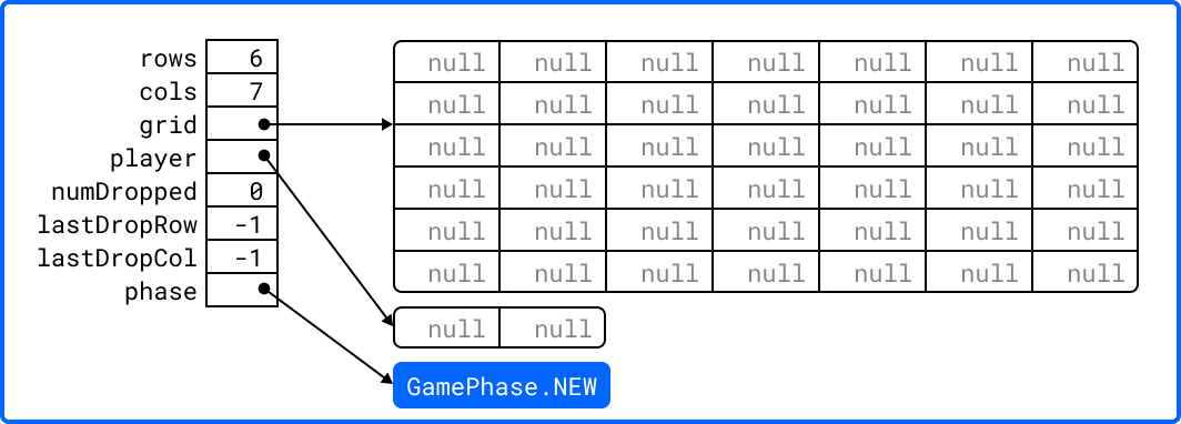 To prepare a new game of Connect Four, the grid is setup to accommodate an acceptable number of rows and columns; however, it should not yet contain any tokens.